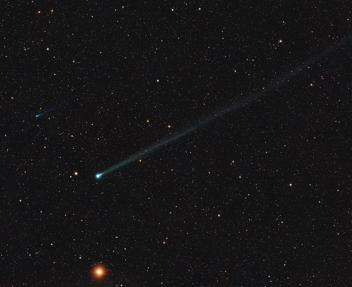 Opis: Na tym obejmującym prawie 7° teleskopowym polu widzenia, zarejestrowanym 21 września nowy gość w wewnętrznym Układzie Słonecznym kometa C/2025 R2 (SWAN) popisuje się długim warkoczem jonowym, rozciągającym się po przekątnej przez cały kadr. Powyżej i na lewo od zielonkawej komy SWAN-a można dostrzec również debiutującą w wewnętrznym Układzie Słonecznym słabszą kometarną towarzyszkę C/2025 K1 (ATLAS), niewiele wybijającą się ponad tło morza gwiazd w konstelacji Panny (Virgo). Obie nowe komety odkryto dopiero w 2025 r., a dzielą one owe niebiańskie zdjęcie z rdzawą planetą Mars (na dole), bardziej znanym wędrowcem na nocnym niebie planety Ziemia. Może się zdawać, że obie komety ścigają się, sunąc prawie łeb w łeb w swojej podróży przez wewnętrzny Układ Słoneczny oraz wokół Słońca. Kometa SWAN osiągnęła już jednak swoje peryhelium lub największe zbliżenie do Słońca 12 września i teraz odlatuje w kosmos na swojej orbicie. Kometa ATLAS natomiast wciąż zbliża się do Słońca i przejdzie przez swoje peryhelium 8 października.